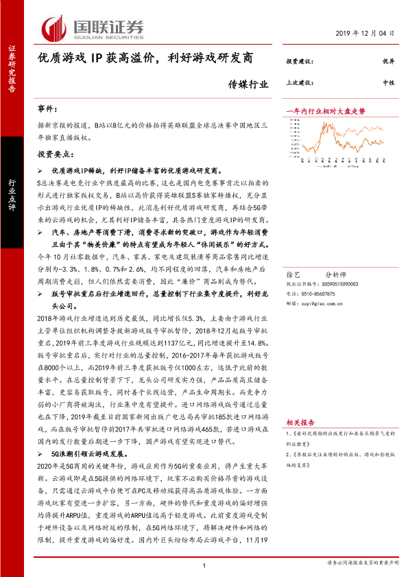 【国联证券】【20191204】传媒行业:优质游戏IP获高溢价,利好游戏研发商-4页