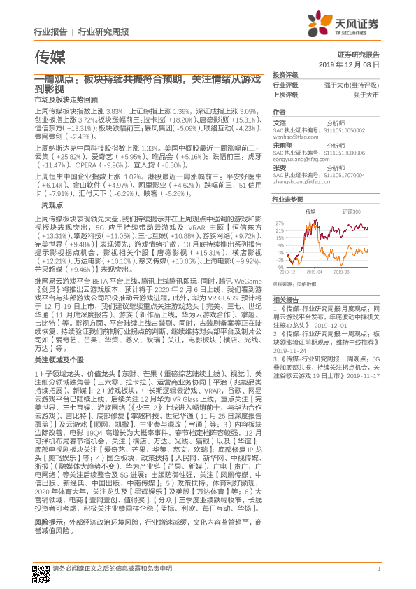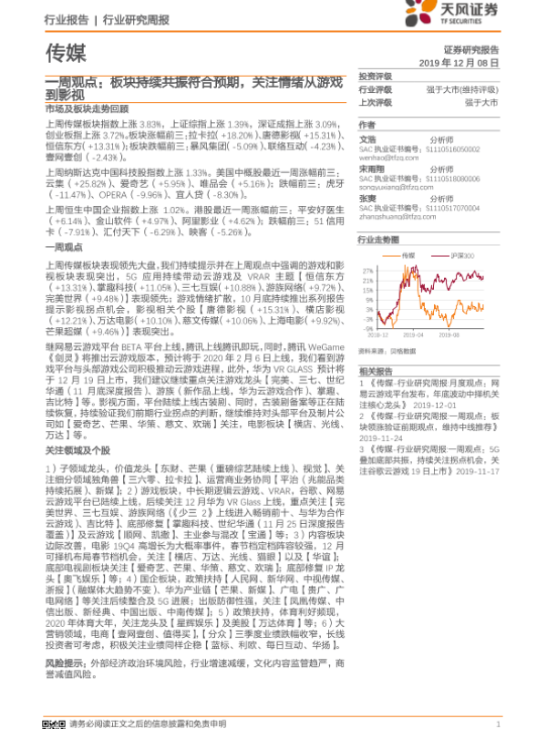 【天风证券】【20191208】传媒一周观点:板块持续共振符合预期,关注情绪从游戏到影视-28页
