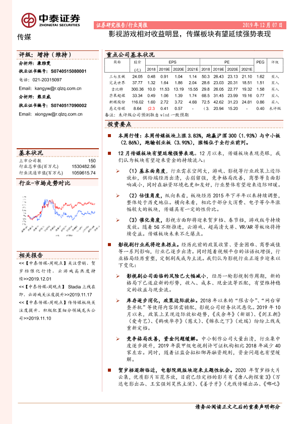 【中泰证券】【20191207】20191207-中泰证券-传媒行业周报:影视游戏相对收益明显,传媒板块有望延续强势表现-12页