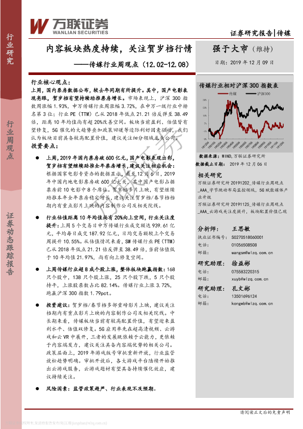 【万联证券】【20191209】20191209-万联证券-传媒行业周观点:内容板块热度持续,关注贺岁档行情-9页