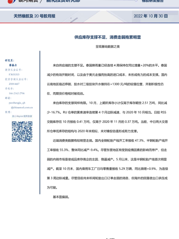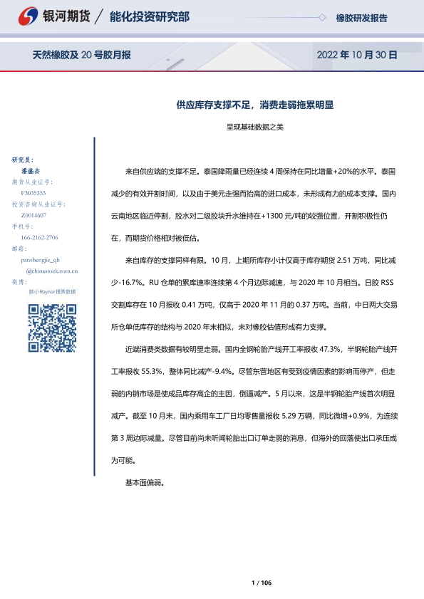 【银河期货】【20221030】天然橡胶及20号胶月报:供应库存支撑不足,消费走弱拖累明显-106页