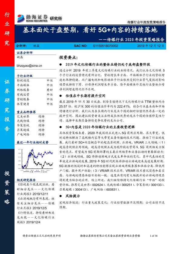 【渤海证券】【20191212】传媒行业2020年投资策略报告:基本面处于盘整期,看好5G+内容的持续落地-38页