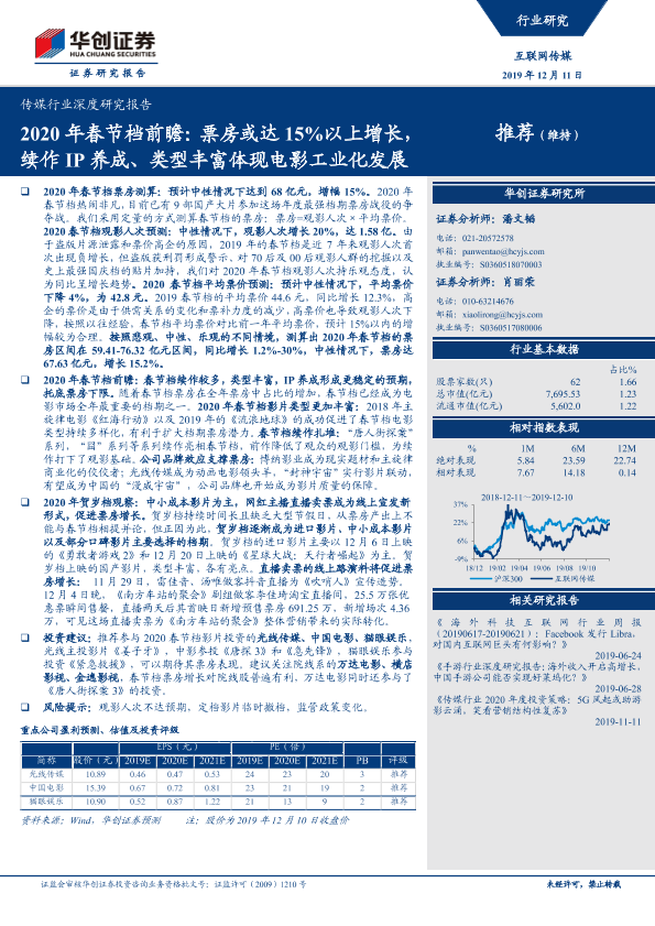 【华创证券】【20191211】2020年春节档前瞻:票房或达15%以上增长,续作IP养成、类型丰富体现电影工业化发展-19页