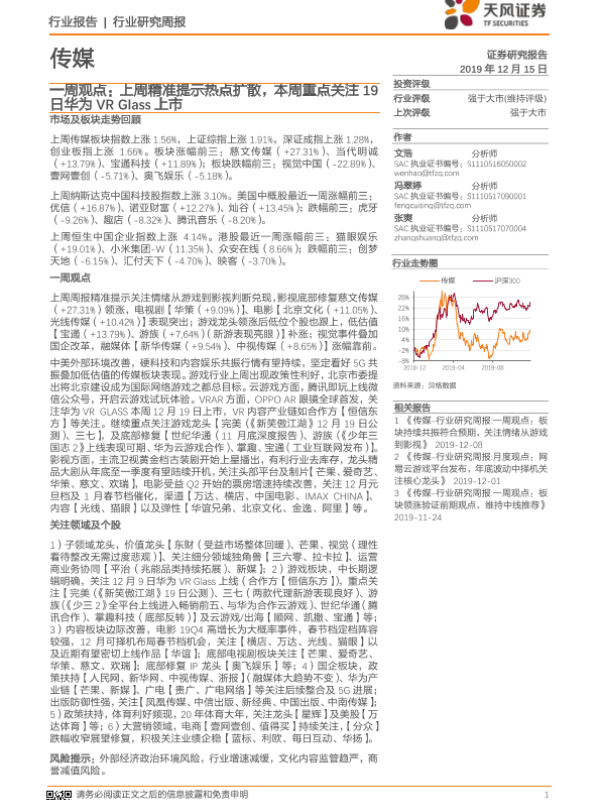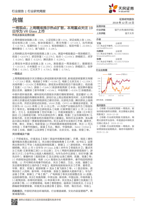 【天风证券】【20191215】20191215-天风证券-传媒一周观点:上周精准提示热点扩散,本周重点关注19日华为VR Glass上市-27页