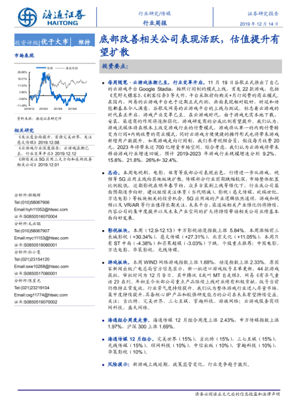【海通证券】【20191214】20191214-海通证券-传媒行业周报:底部改善相关公司表现活跃,估值提升有望扩散-10页