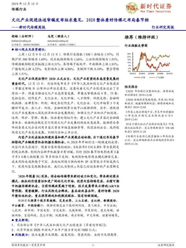 【新时代证券】【20191215】新时代传媒周报:文化产业促进法送审稿发布征求意见,2020整体看好传媒之布局春节档-13页