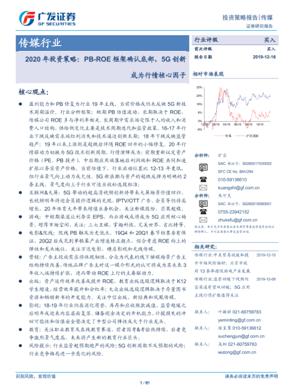 2020年预测 5G创新 PB-ROE框架 传媒行业 投资策略