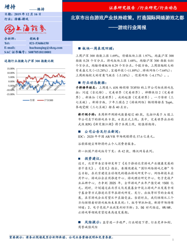 【上海证券】【20191216】游戏行业周报:北京市出台游戏产业扶持政策,打造国际网络游戏之都-8页