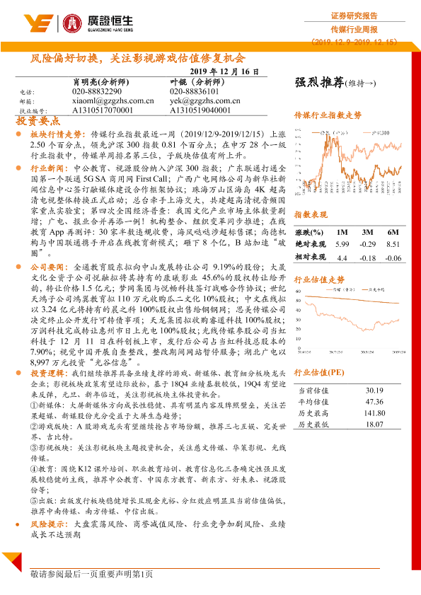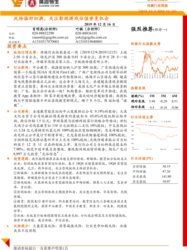 【广证恒生】【20191216】传媒行业周报:风险偏好切换,关注影视游戏估值修复机会-19页