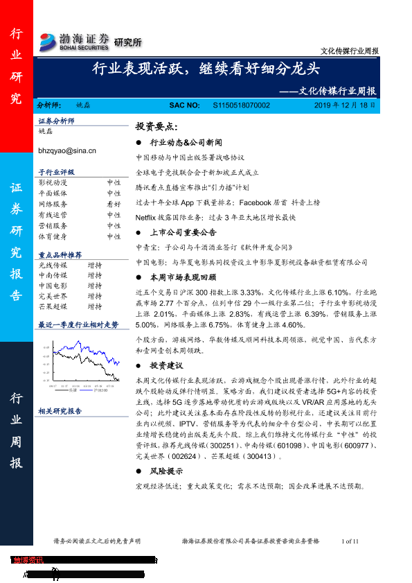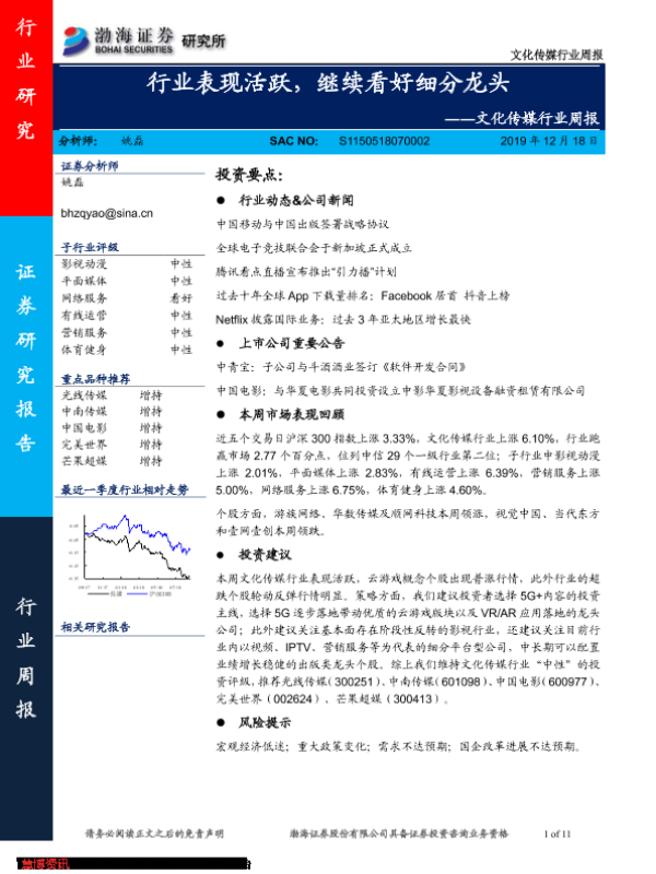 【渤海证券】【20191218】文化传媒行业周报:行业表现活跃,继续看好细分龙头-11页