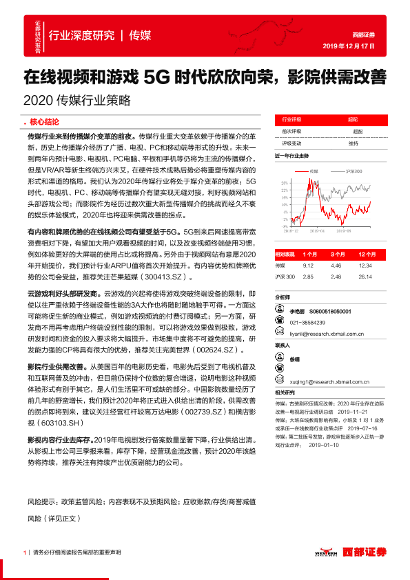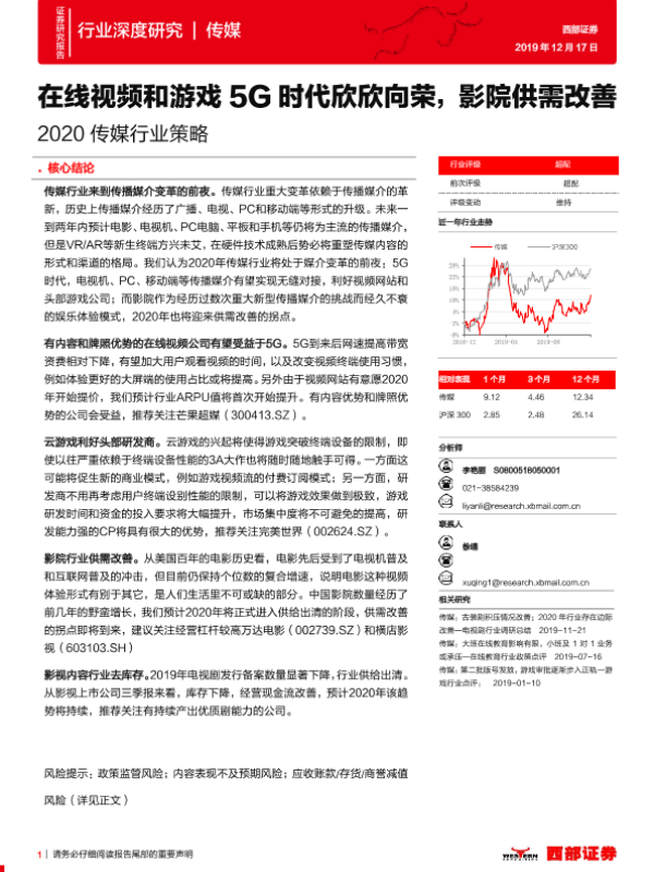 【西部证券】【20191217】2020传媒行业策略:在线视频和游戏5G时代欣欣向荣,影院供需改善-43页