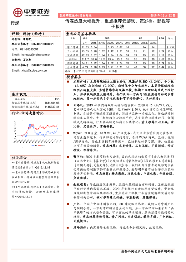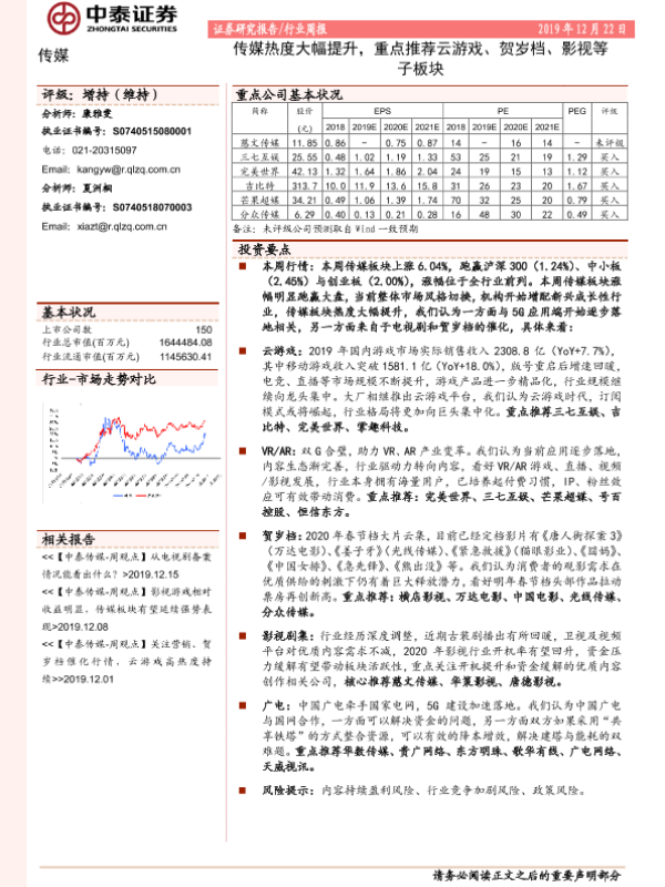【中泰证券】【20191222】传媒行业周报:传媒热度大幅提升,重点推荐云游戏、贺岁档、影视等子板块-10页