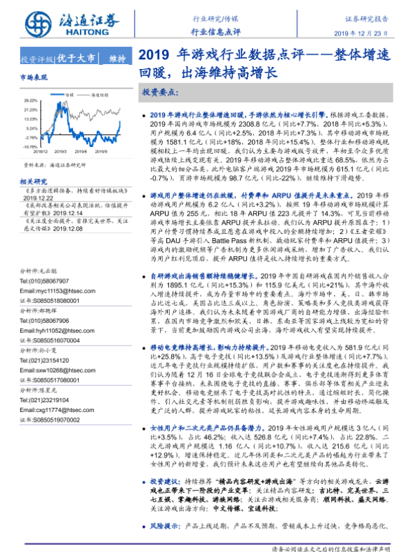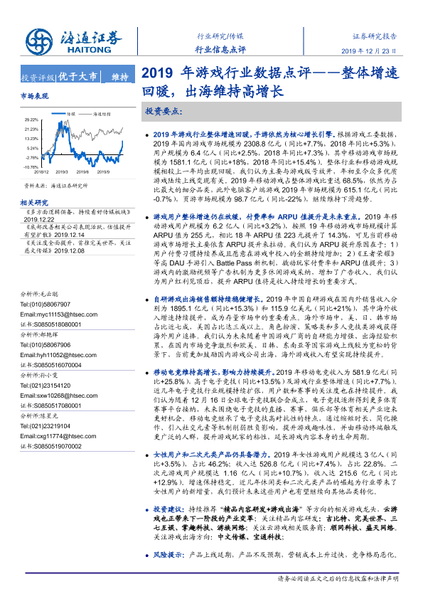 【海通证券】【20191223】2019年游戏行业数据点评-整体增速回暖,出海维持高增长-4页