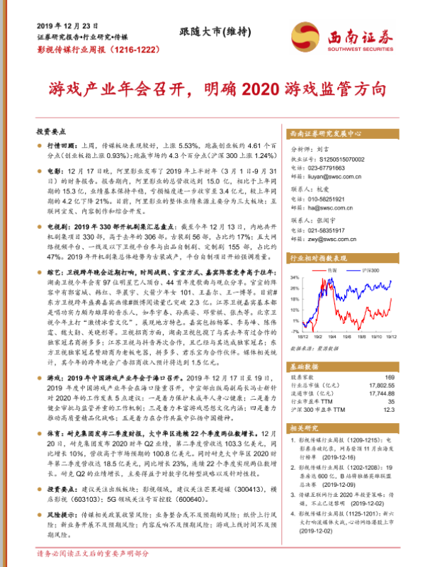 【西南证券】【20191223】影视传媒行业周报:游戏产业年会召开,明确2020游戏监管方向-22页