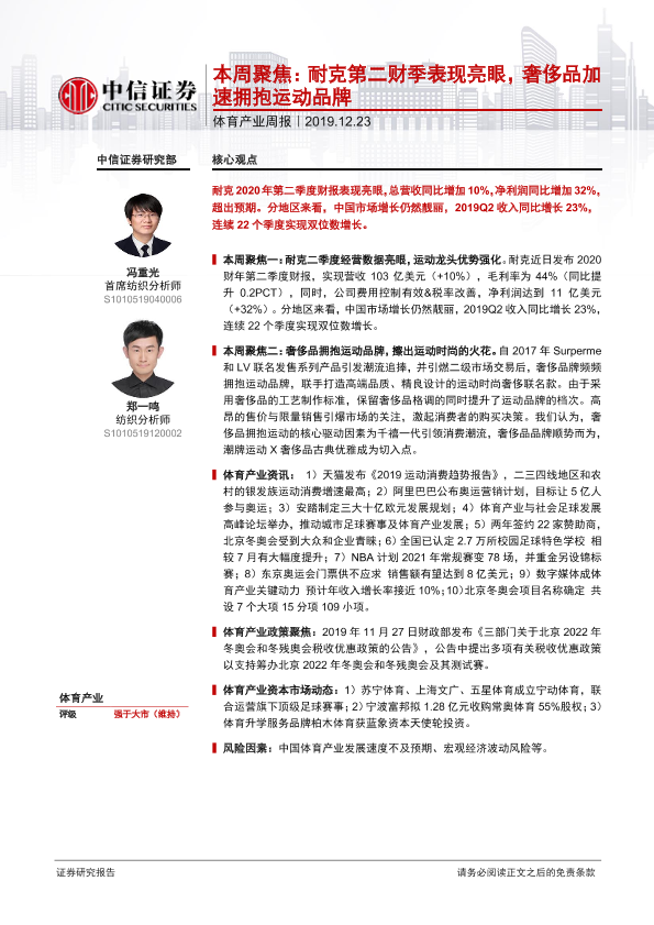 【中信证券】【20191223】体育产业周报:本周聚焦:耐克第二财季表现亮眼,奢侈品加速拥抱运动品牌-20页
