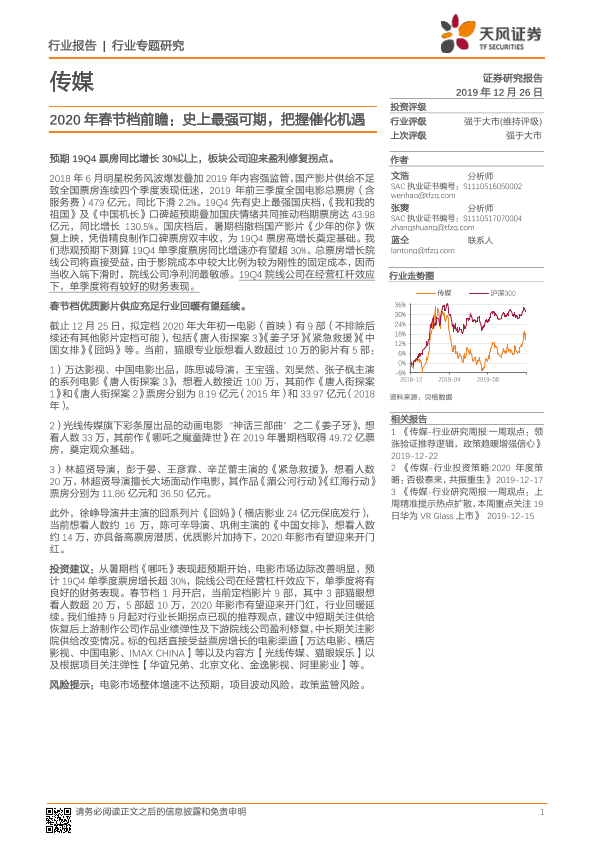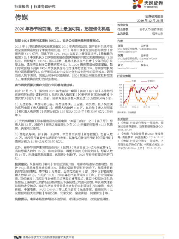 【天风证券】【20191226】传媒2020年春节档前瞻:史上最强可期,把握催化机遇-6页