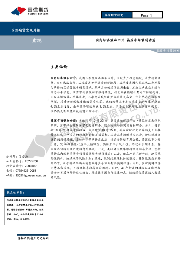 【国信期货】【20221030】宏观月报:国内经济温和回升 英国市场暂别动荡-16页