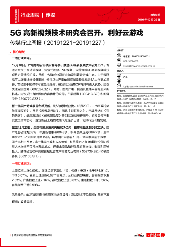 【西部证券】【20191229】20191229-西部证券-传媒行业周报:5G高新视频技术研究会召开,利好云游戏-15页
