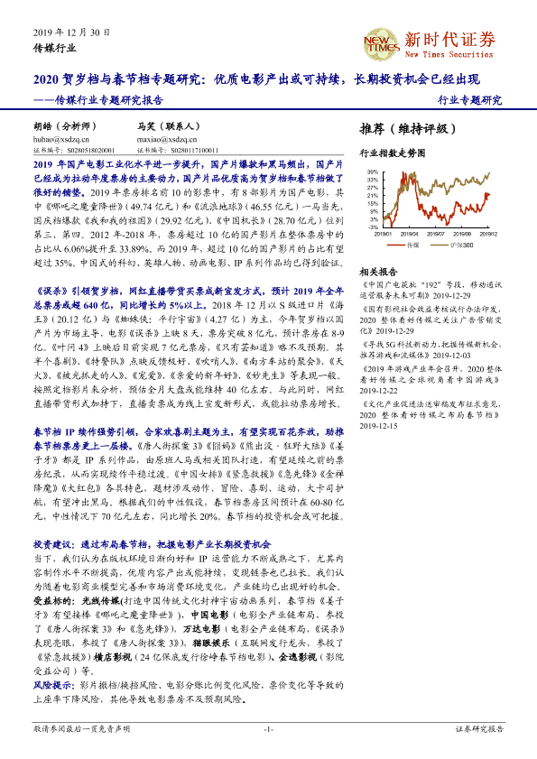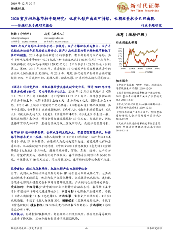 【新时代证券】【20191230】2020贺岁档与春节档专题研究:优质电影产出或可持续,长期投资机会已经出现-9页