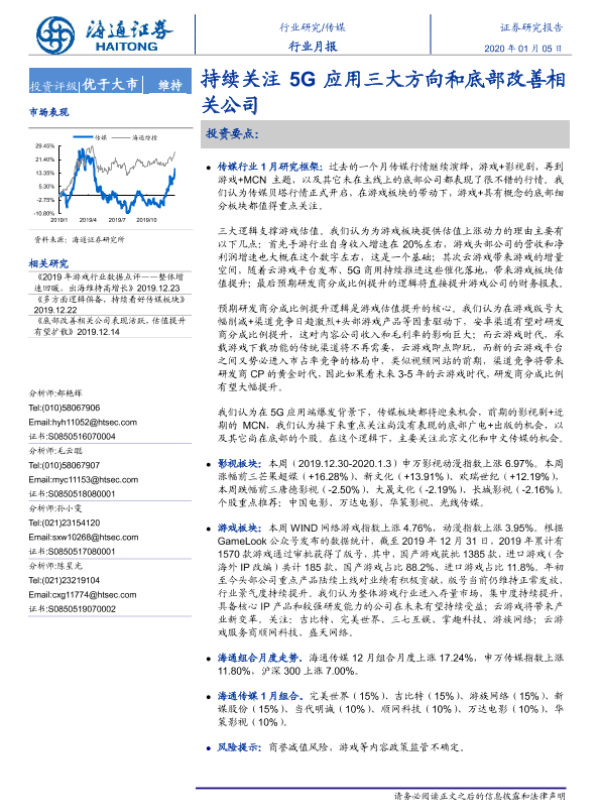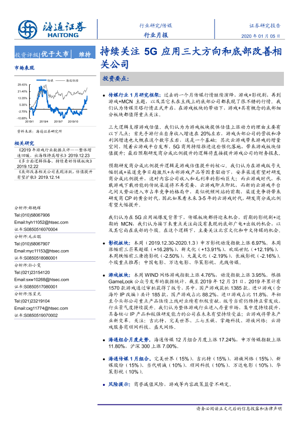【海通证券】【20200105】20200105-海通证券-传媒行业月报:持续关注5G应用三大方向和底部改善相关公司-10页