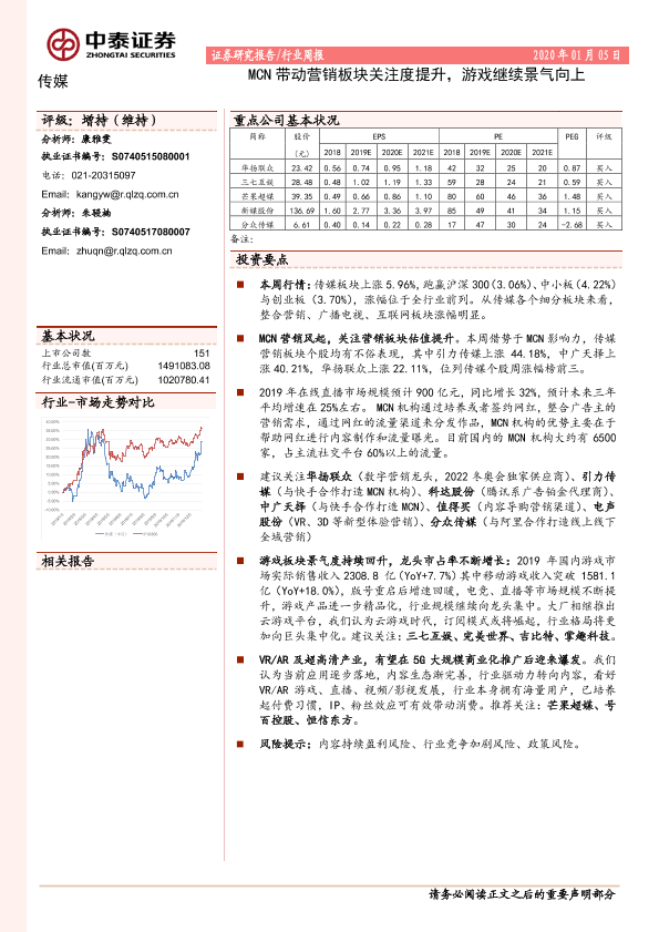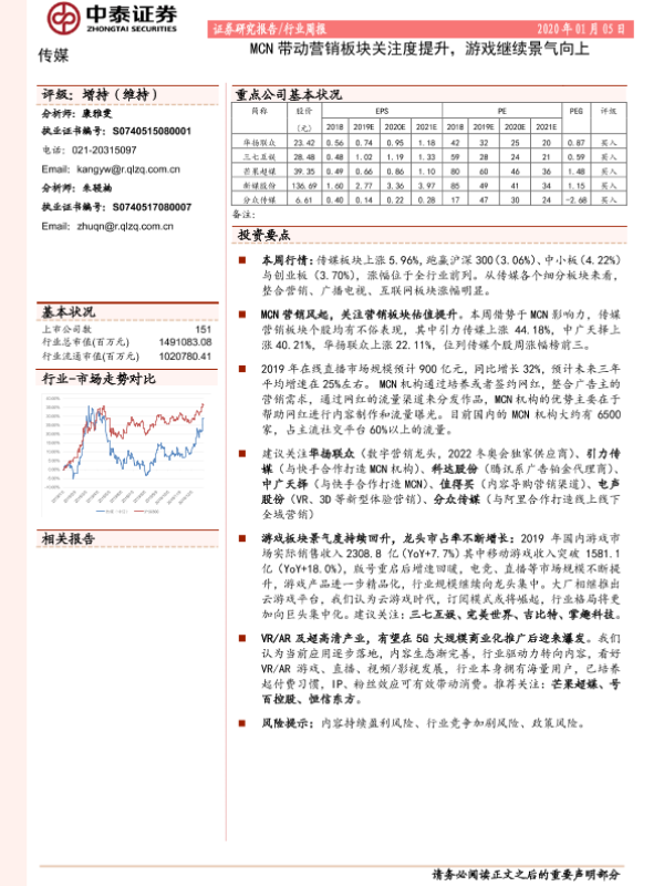 【中泰证券】【20200105】20200105-中泰证券-传媒行业周报:MCN带动营销板块关注度提升,游戏继续景气向上-9页