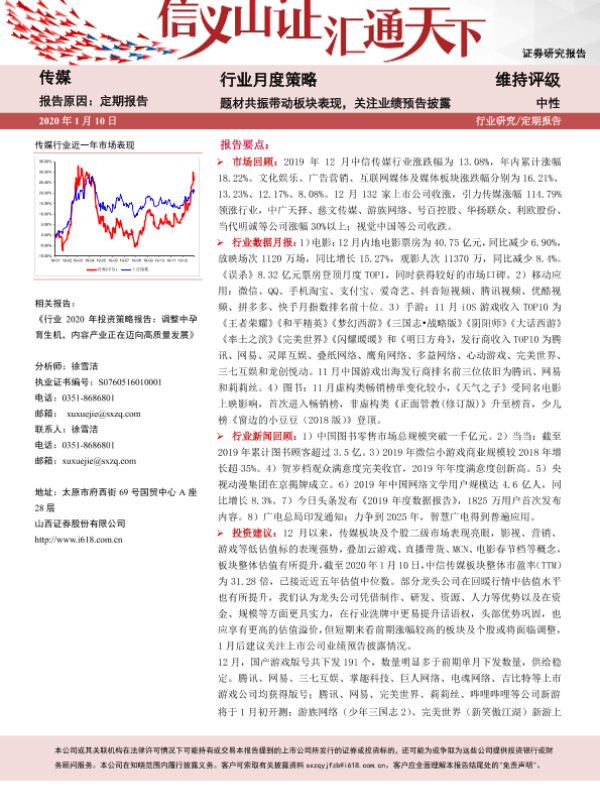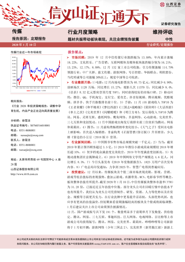 【山西证券】【20200110】20200110-山西证券-传媒行业月度策略:题材共振带动板块表现,关注业绩预告披露-20页