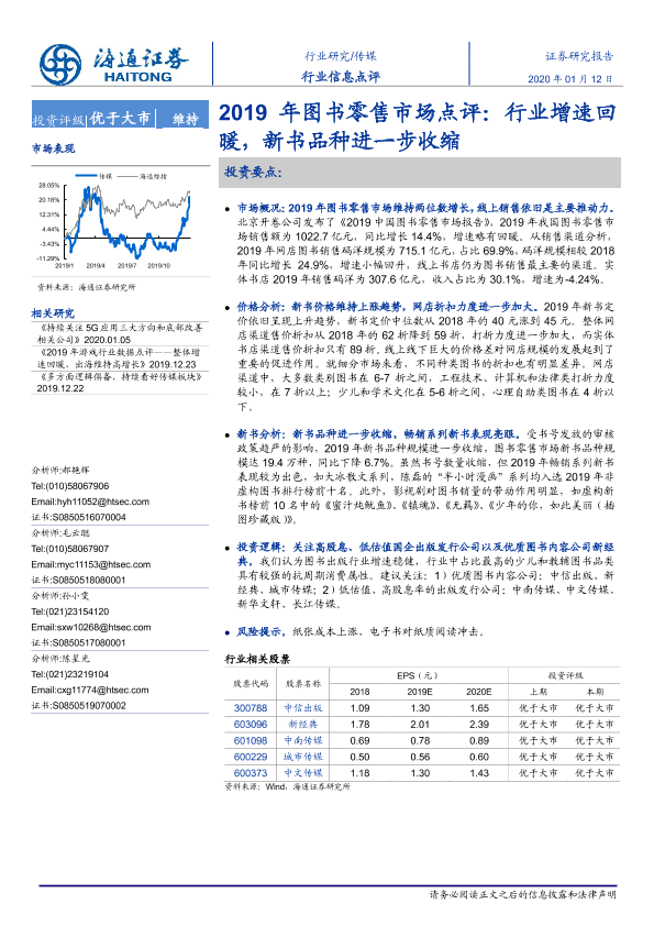 【海通证券】【20200112】2019年图书零售市场点评:行业增速回暖,新书品种进一步收缩-5页