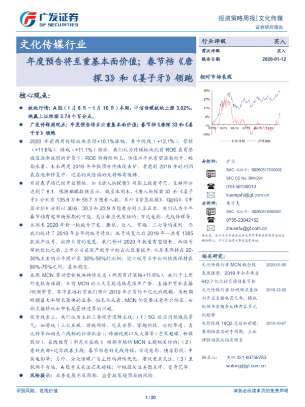 【广发证券】【20200112】20200112-广发证券-文化传媒行业投资策略周报:年度预告将至重基本面价值;春节档《唐探3》和《姜子牙》领跑-20页
