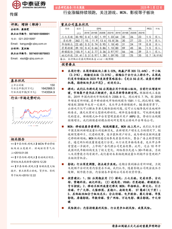 【中泰证券】【20200112】20200112-中泰证券-传媒行业周报:行业涨幅持续领跑,关注游戏、MCN、影视等子板块-10页