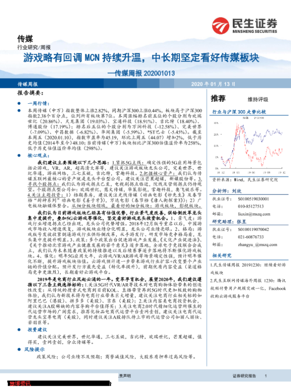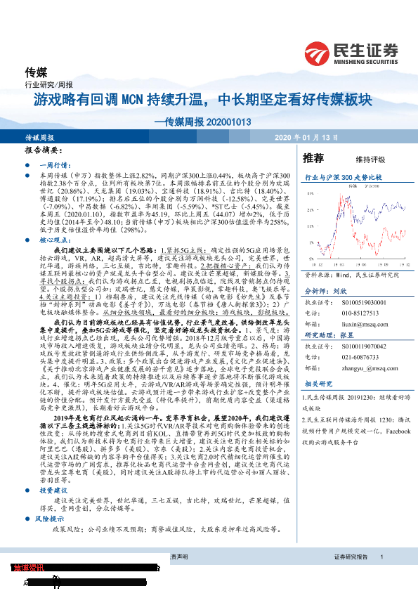 【民生证券】【20200113】20200113-民生证券-传媒周报:游戏略有回调MCN持续升温,中长期坚定看好传媒板块-17页