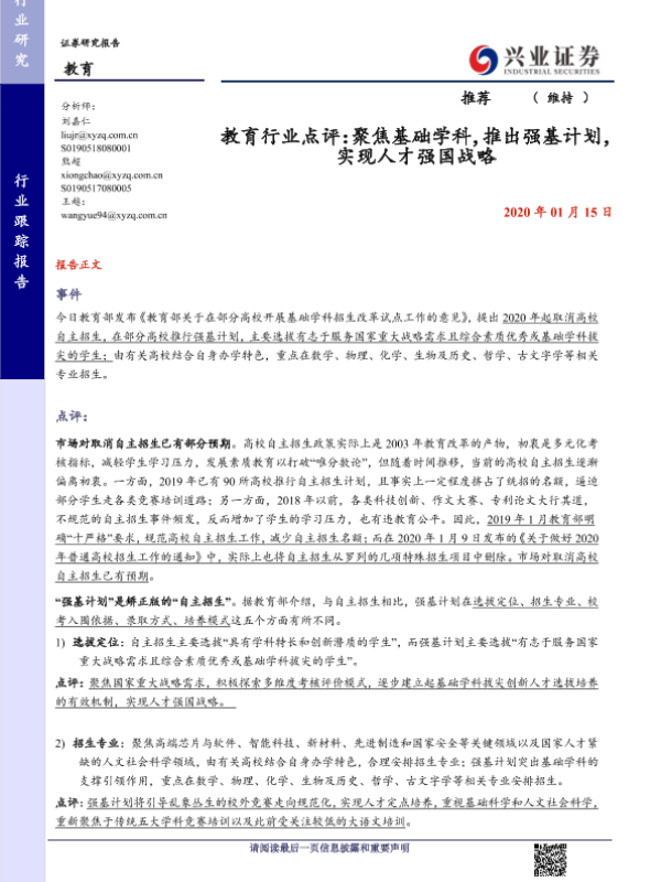 【兴业证券】【20200115】教育行业点评:聚焦基础学科,推出强基计划,实现人才强国战略-5页