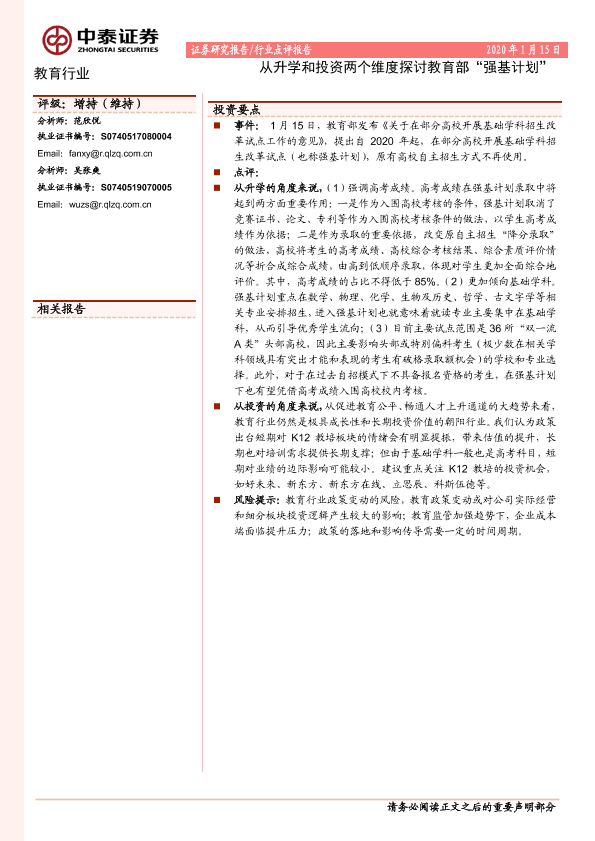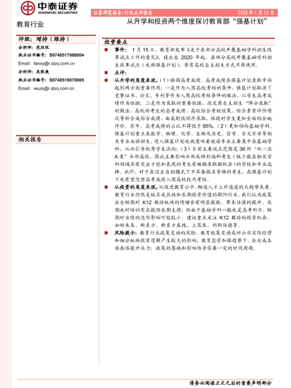 【中泰证券】【20200115】教育行业:从升学和投资两个维度探讨教育部“强基计划”-6页