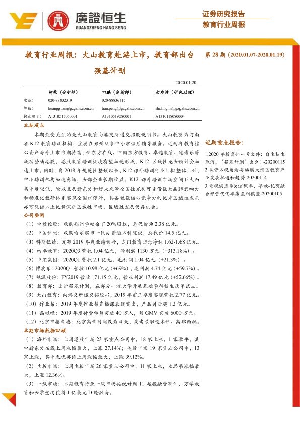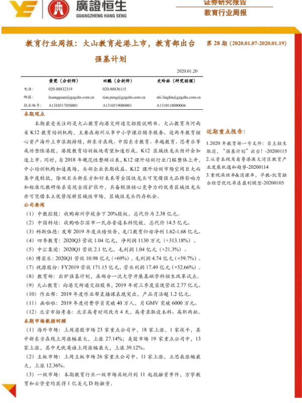 【广证恒生】【20200120】教育行业周报:大山教育赴港上市,教育部出台强基计划-11页