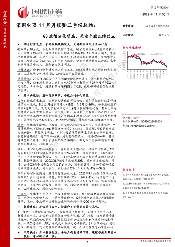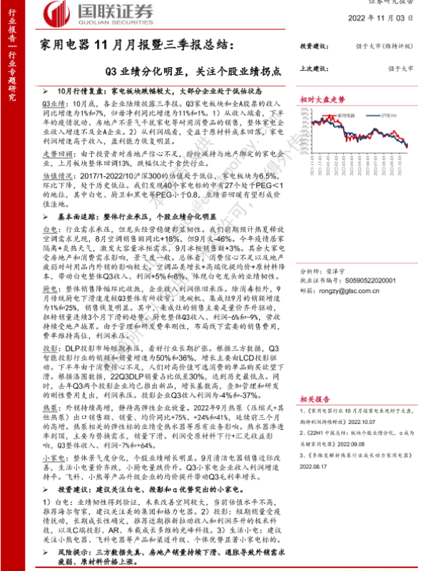 【国联证券】【20221103】家用电器11月月报暨三季报总结:Q3业绩分化明显,关注个股业绩拐点-25页