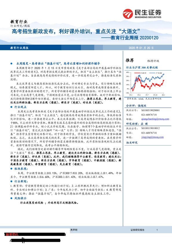 【民生证券】【20200120】20200120-民生证券-教育行业周报:高考招生新政发布,利好课外培训,重点关注“大语文”-12页