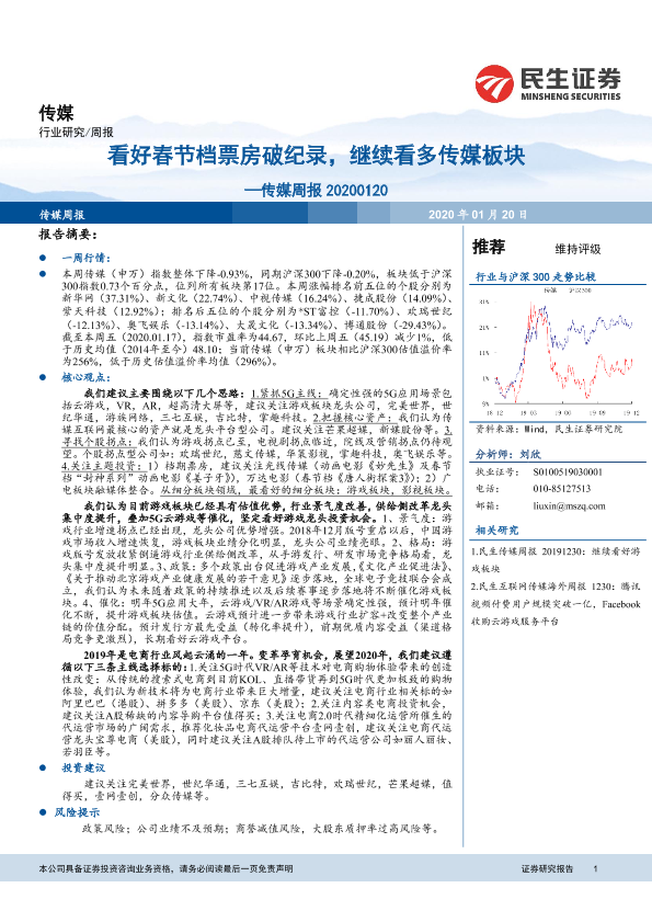 【民生证券】【20200120】20200120-民生证券-传媒周报:看好春节档票房破纪录,继续看多传媒板块-17页