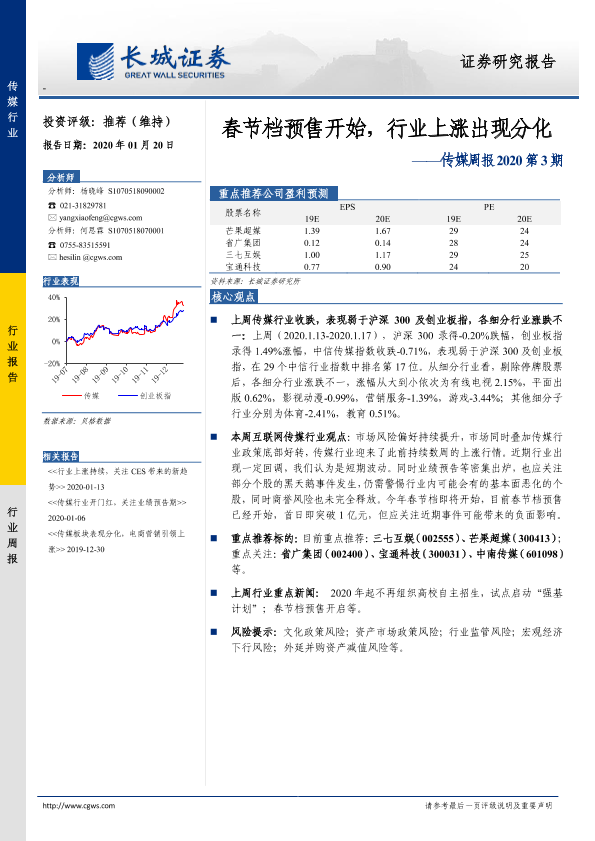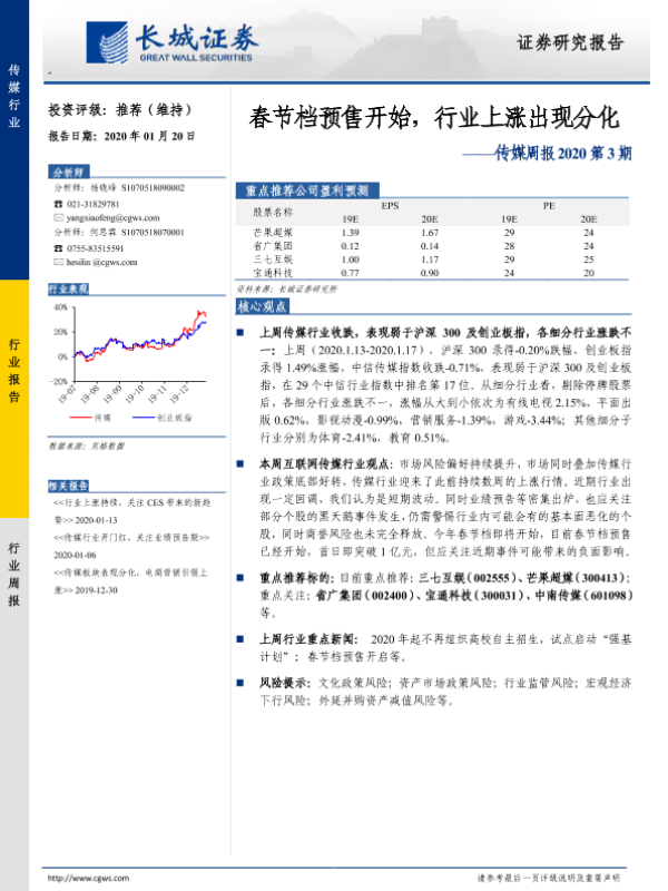 【长城证券】【20200120】传媒周报2020第3期:春节档预售开始,行业上涨出现分化-14页