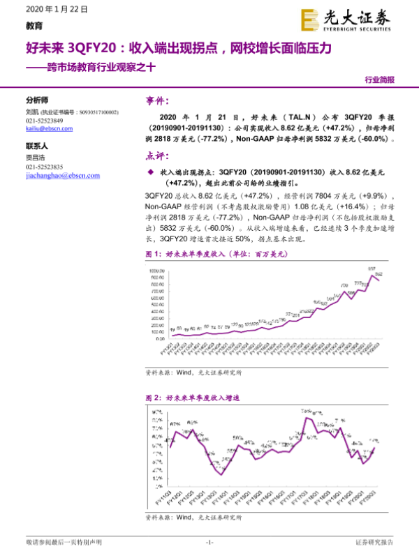 【光大证券】【20200122】跨市场教育行业观察之十:好未来3QFY20:收入端出现拐点,网校增长面临压力-6页