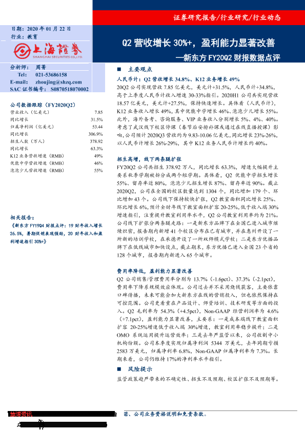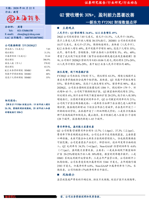 【上海证券】【20200122】教育:新东方FY20Q2财报数据点评:Q2营收增长30%+,盈利能力显著改善-6页