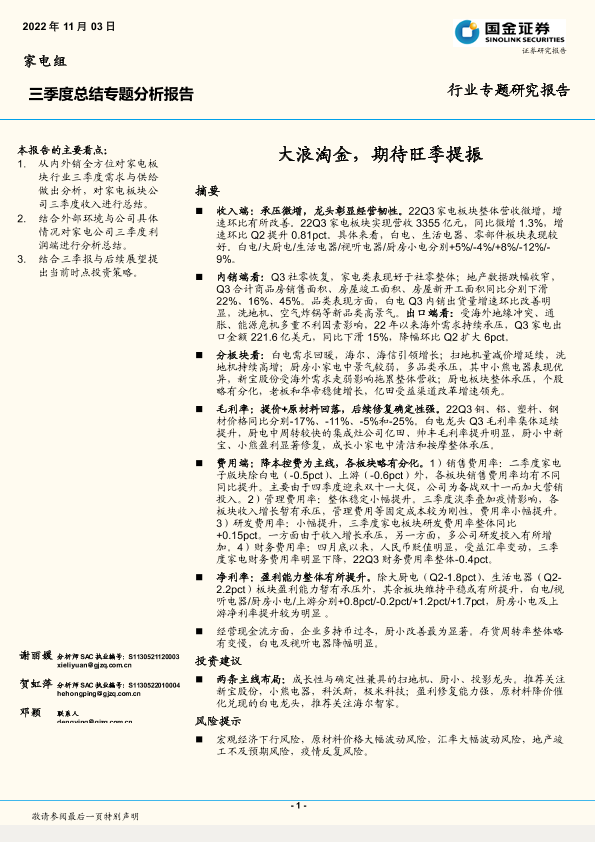 【国金证券】【20221103】家电行业三季度总结专题分析报告:大浪淘金,期待旺季提振-27页