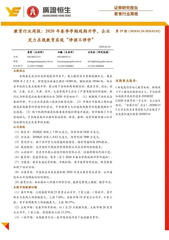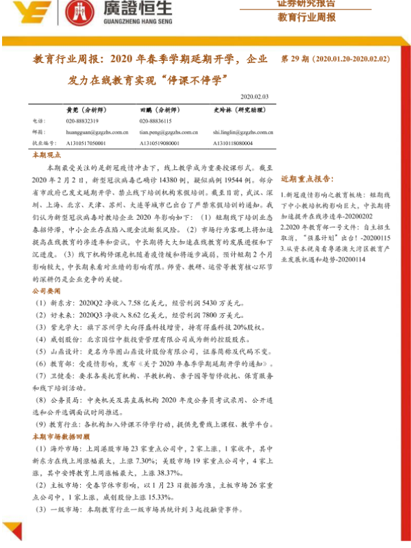 【广证恒生】【20200203】教育行业周报:2020年春季学期延期开学,企业发力在线教育实现“停课不停学”-13页