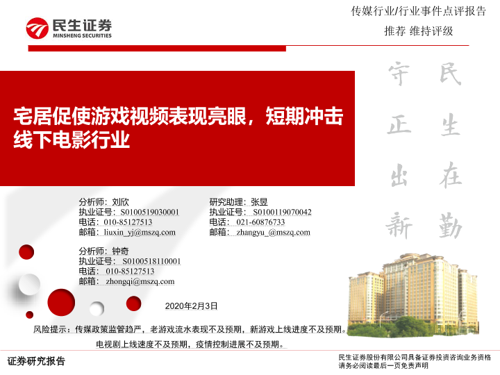 【民生证券】【20200203】宅居促使游戏视频表现亮眼,短期冲击线下电影行业-18页