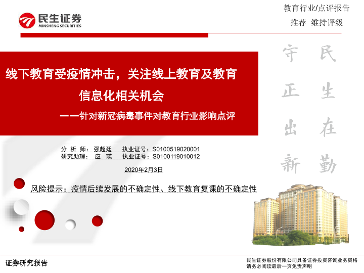 【民生证券】【20200203】针对新冠病毒事件对教育行业影响点评:线下教育受疫情冲击,关注线上教育及教育信息化相关机会-15页