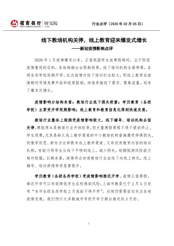 【招商银行】【20200205】新冠疫情影响点评:线下教培机构关停,线上教育迎来爆发式增长-3页