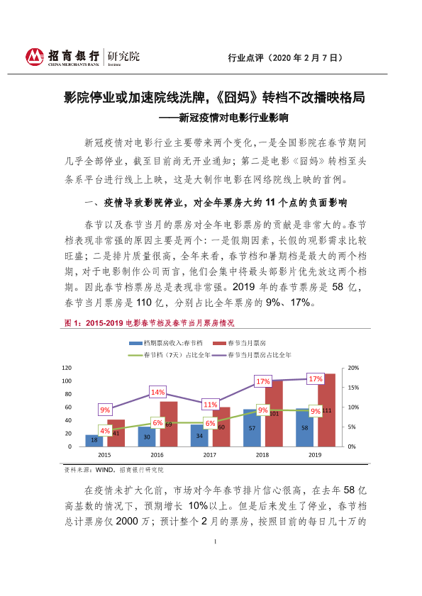 【招商银行】【20200207】新冠疫情对电影行业影响:影院停业或加速院线洗牌,《囧妈》转档不改播映格局-4页