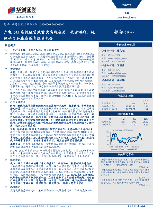 【华创证券】【20200209】传媒行业周报2020年第4期:广电5G在抗疫前线首次实战应用,关注游戏、视频平台和在线教育投资机会-15页