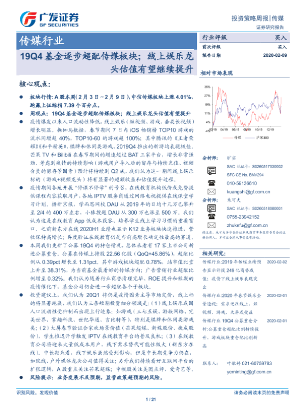 【广发证券】【20200209】20200209-广发证券-传媒行业投资策略周报:19Q4基金逐步超配传媒板块;线上娱乐龙头估值有望继续提升-21页