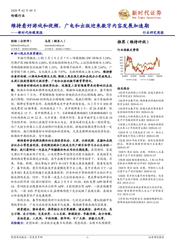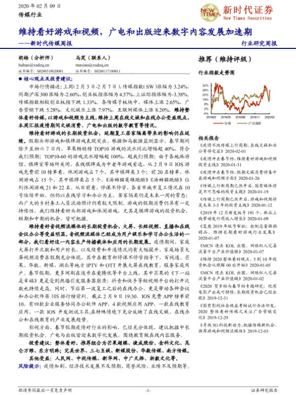 【新时代证券】【20200209】20200209-新时代证券-传媒周报:维持看好游戏和视频,广电和出版迎来数字内容发展加速期-16页