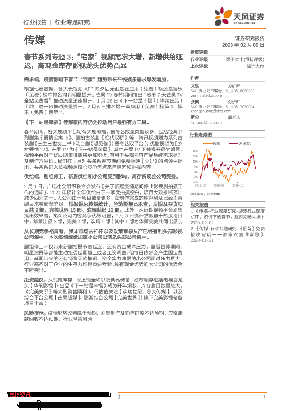 【天风证券】【20200209】春节系列专题3:“宅家”视频需求大增,新增供给延迟,高现金库存影视龙头优势凸显-10页