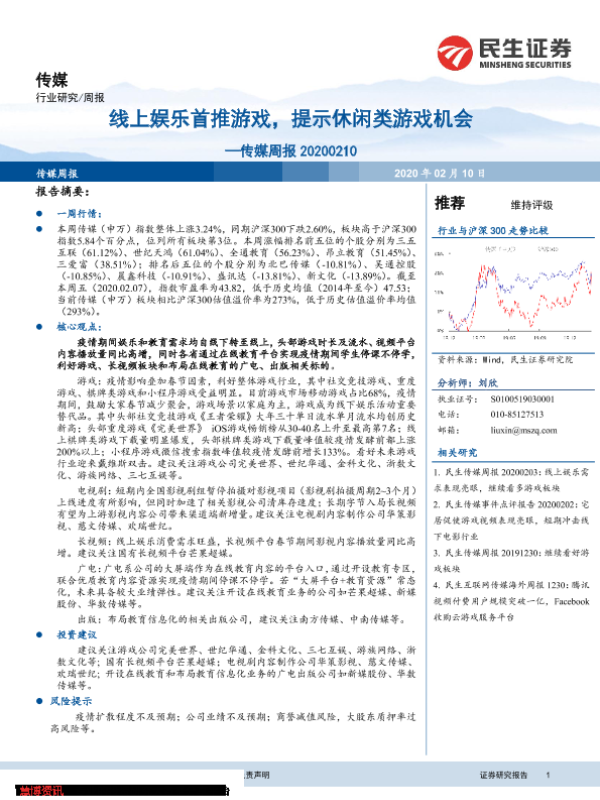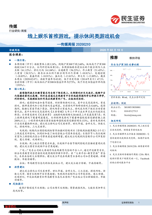 【民生证券】【20200210】线上娱乐首推游戏,提示休闲类游戏机会——传媒周报 20200210-17页